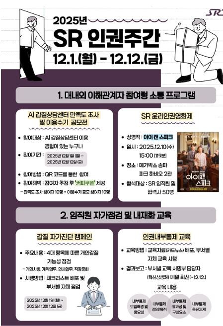 [매일안전신문=김진섭 기자] 에스알이 세계 인권의 날을 맞이해 1일부터 12일까지 ‘에스알 인권주간’을 운영하고, 임직원‧협력사 인권감수성 향상을 위한 다양한 프로그램을 진행한다.