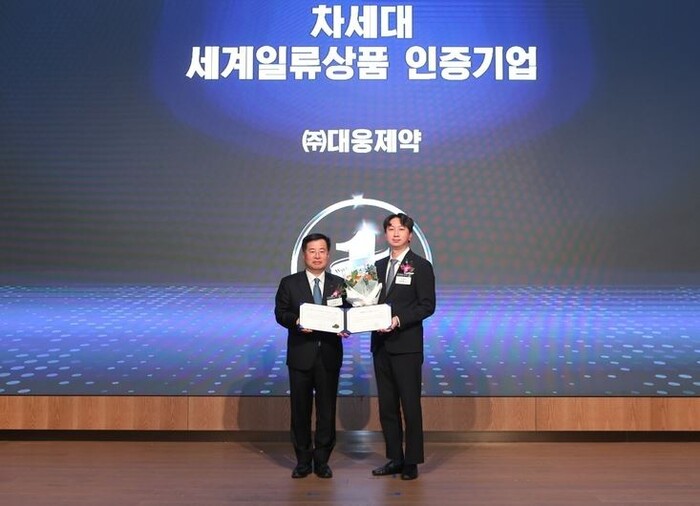 | ▲김도영 대웅제약 글로벌사업센터장(오른쪽)이 세계일류상품 인증서를 받고 기념촬영을 하고 있다. (사진=대웅제약) |