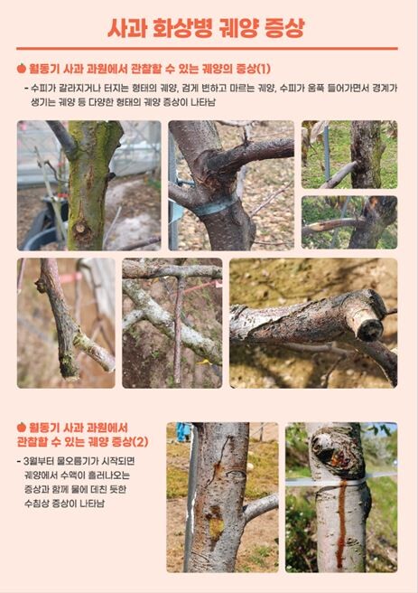과수화상병 병원균은 궤양 부위에서 월동하고 봄철 기온(18~21℃)이 오르면 활동을 재개하므로, 반드시 겨울철에 궤양과 의심주를 제거해 병 확산을 막아야 한다.