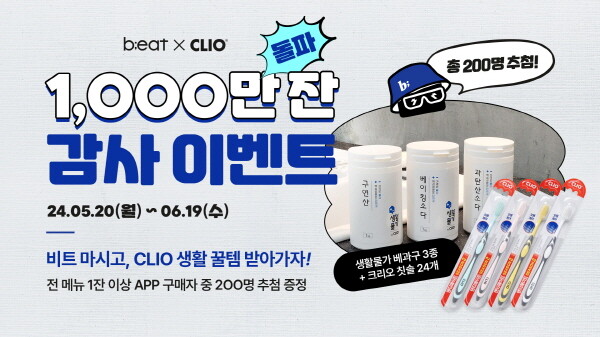이번 이벤트는 CLIO와 함께 협업해 진행한다. 이벤트는 5월 20일부터 6월 19일까지 한달동안 진행되며, 비트 앱으로 기간 내 1잔 이상 구매한 회원을 대상으로 CLIO 덴티메이트2 칫솔 세트+생활물가 다목적 세제 3종 세트 패키지를 총 200명에게 증정한다.