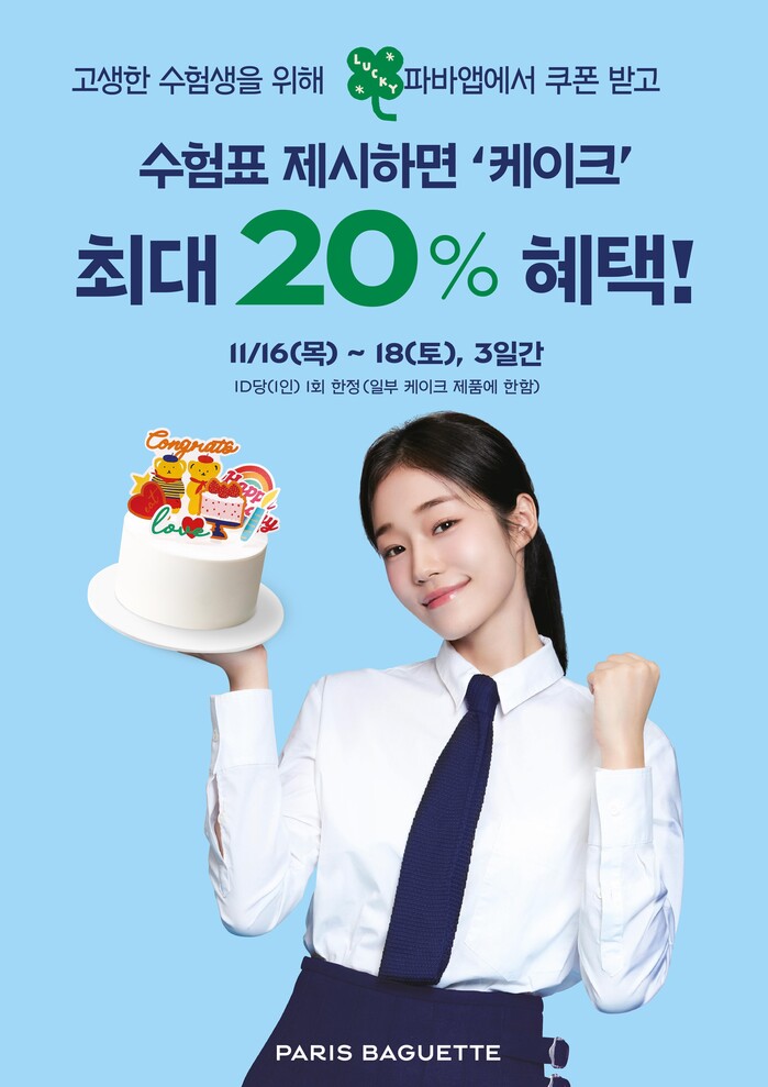 파리바게뜨가 오는 11월 16일~ 18일까지 수험표로 케이크 구매 시 혜택을 받을 수 있는 파바앱 프로모션을 진행한다고 15일 밝혔다.
