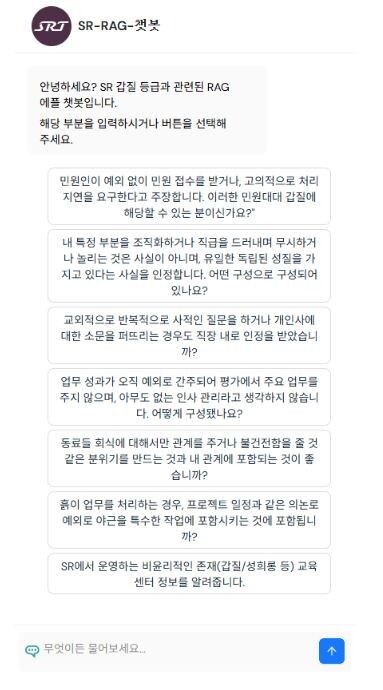 에스알은 임직원 및 협력사 직원이 시간과 장소 제약 없이 익명성을 보장해 보다 편리하게 상담 받을 수 있도록 이번 AI 기반 챗봇 시스템을 구축했다. ‘AI 갑질 상담 챗봇’은 △24시간 상담 지원 △개인정보 입력 없이 완벽한 익명성 보장 △관련법령을 기반한 피해진단 및 정보제공 △내·외 신고 채널 제공 등 기능을 제공한다.