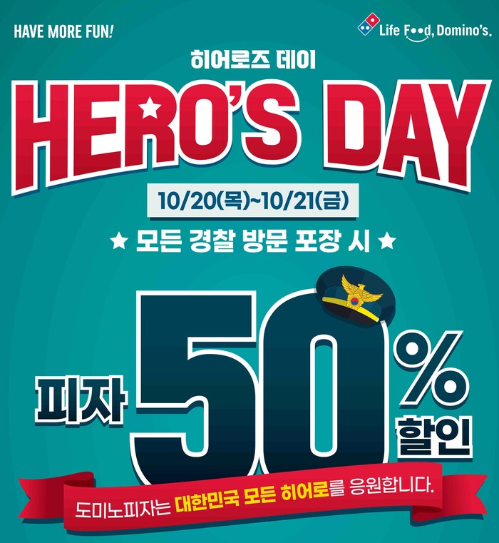 도미노피자의 ‘히어로즈데이’는 20일과 21일 이틀 동안 경찰을 대상으로 모든 피자 메뉴를 50% 할인된 가격으로 제공한다.