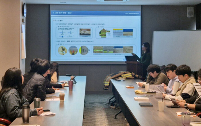 교육은 섬유 후가공 기술과 성능 평가의 이해, 특수 방화복 외관 평가 사례 분석, 밀도 및 번수 측정 실습, 시험평가 표준 안내 등으로 구성해 현장 실무자의 전문 역량 강화에 집중했다. 발수제에 널리 사용된 PFAS(과불화화합물) 규제를 포함한 환경·안전 정책 동향을 공유해 기업의 기술 개발 및 대응 역량 또한 높였다.