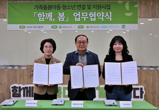 서울시복지재단은 지난 13일 재단법인 아름다운가게, 사단법인 피스모모와 함께 ‘가족돌봄아동‧청소년 연결 및 지원사업 : 함께, 봄’ 업무협약(MOU)을 체결했다.