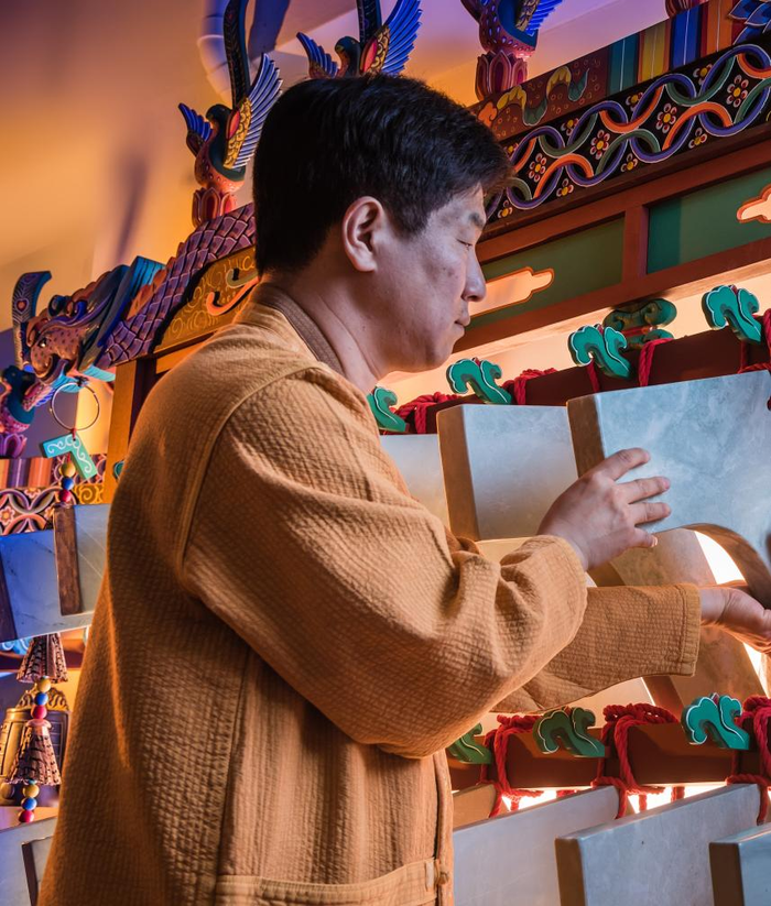 ▲ 김종민 씨는 현(現) 보유자 김현곤 씨의 아들로, 부친의 작업을 도우며 편종·편경 제작 기능을 전수받았다. 2013년 전수장학생으로 선정된 후 2016년 이수자가 되었으며, 문헌에 기반한 전통 악기 연구와 악기 제작기량을 꾸준히 연마하여 해당 분야를 체계적으로 전승하고 있다는 평가를 받았다.