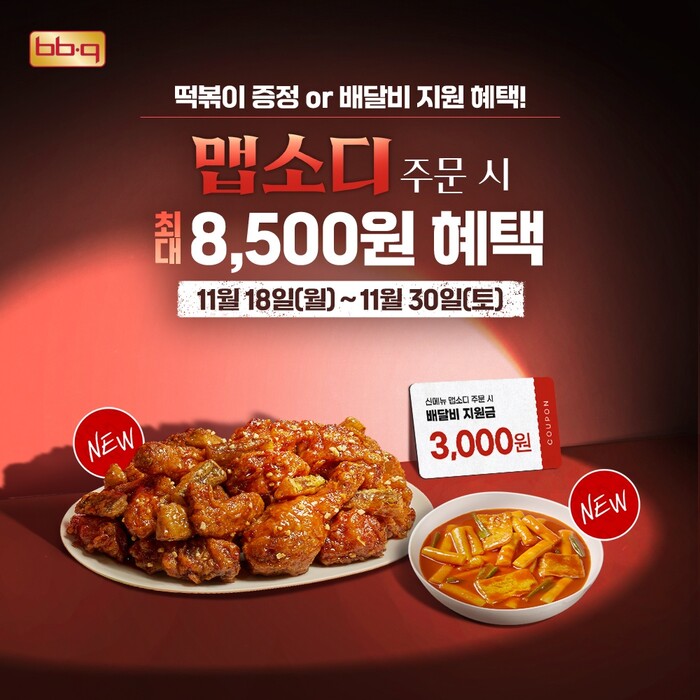 이번 프로모션은 오는 30일까지 진행된다. BBQ앱과 웹사이트에서 맵소디 주문 시 별도의 쿠폰 적용 없이도 1,500원 할인된 가격에 즐길 수 있다. 더불어 배달비 최대 3,000원 지원 쿠폰과 새롭게 출시된 사이드 메뉴인 BBQ 떡볶이 증정 쿠폰이 자동으로 발행된다. 프로모션 쿠폰은 중복 사용이 불가하며, 1회 주문 시 한 가지 쿠폰만 적용 가능하다.