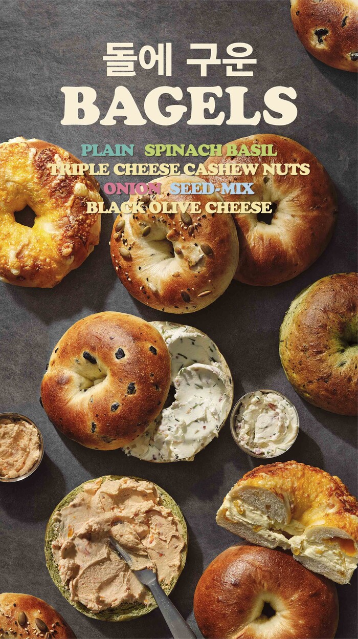 대표 제품은 쫄깃하고 촉촉한 베이글 본연의 맛을 보여주는 ‘돌에 구운 플레인 베이글’ , 블랙 올리브와 고소한 롤치즈가 들어가 짭조름한 맛이 특징인 ‘돌에 구운 블랙올리브치즈 베이글’, 체다, 에멘탈, 그뤼에르 치즈와 캐슈넛이 들어가 고소하고 짭짤한‘돌에 구운 트리플치즈캐슈넛’, 양파, 고추, 베이컨칩이 들어가 한국적인 맛을 내는 ,‘돌에 구운 어니언 베이글’, 시금치와 생바질을 듬뿍 넣어 향긋하고 고급스러운 풍미가 매력적인 ‘돌에 구운 시금치 바질 베이글’, 해바라기씨, 호박, 검은깨, 참깨 토핑으로 고소하고 건강하게 즐기는 ‘돌에 구운 씨앗 베이글’ 등으로 구성됐다.