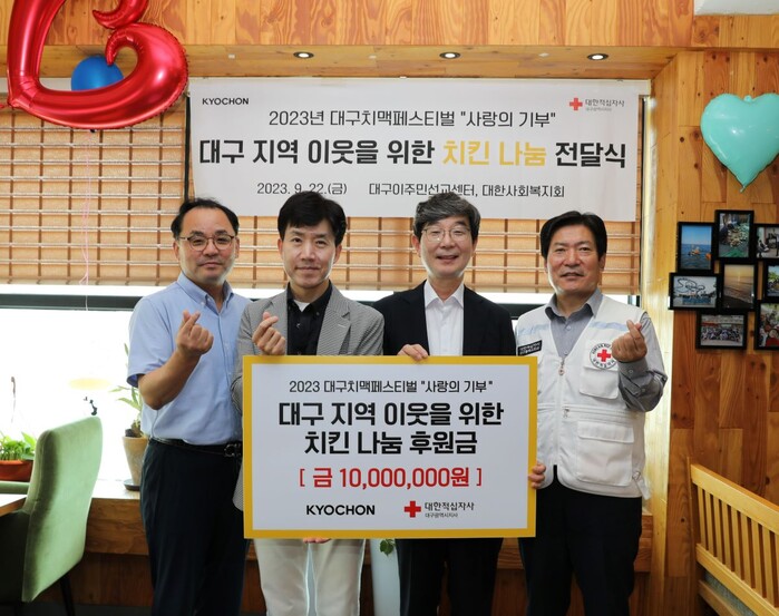 이날 전달된 후원금 1천만 원은 8월 개최된 ‘2023 대구 치맥 페스티벌’ 개막식에서 전달된 것으로, 협력 기관 및 단체에 교촌치킨 제품으로 지원됐다.