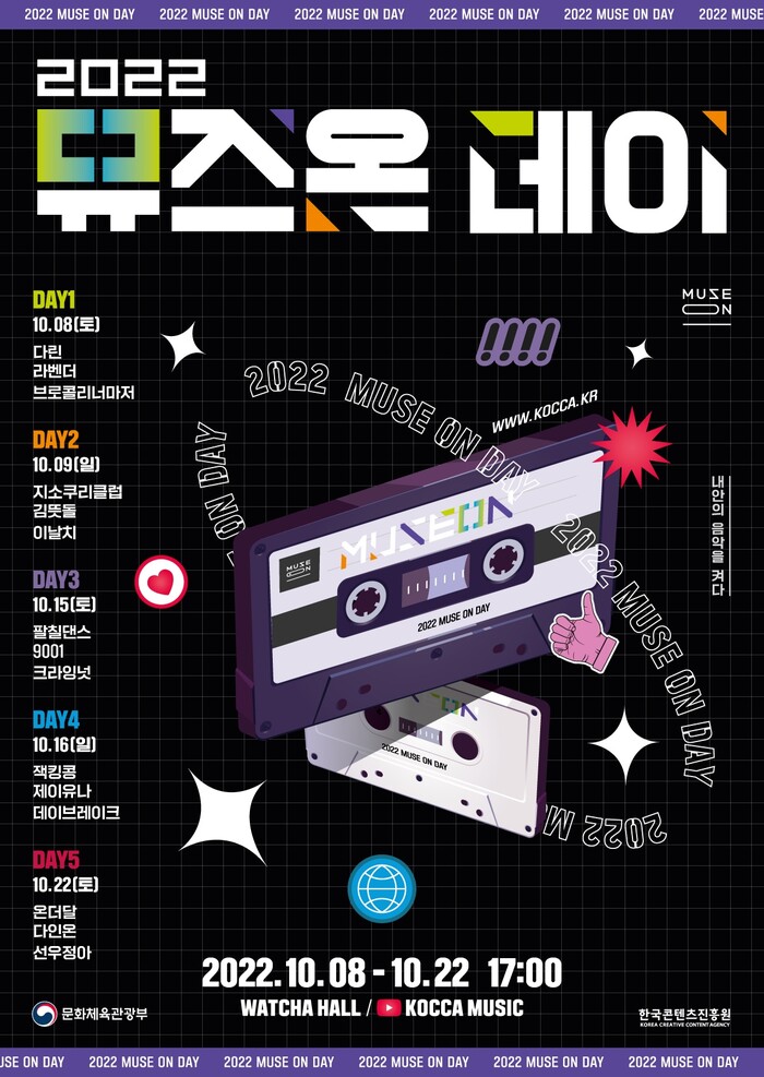 문화체육관광부와 한국콘텐츠진흥원은 신인 뮤지션 발굴‧육성 프로젝트 ‘뮤즈온 2022’에 최종 선정된 뮤지션의 기획공연인 ‘2022 뮤즈온 데이’를 오는 10월 8일부터 서울 마포구 왓챠홀에서 개최한다고 19일 밝혔다.