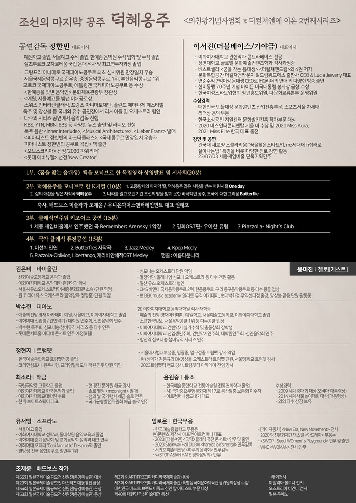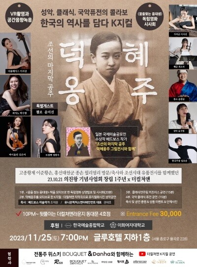 관객들은 덕혜옹주의 삶을 느끼고 그 시대를 상상하며, 예술가들과의 교류를 통해 새로운 영감을 얻는 시간을 가질 것이다.
