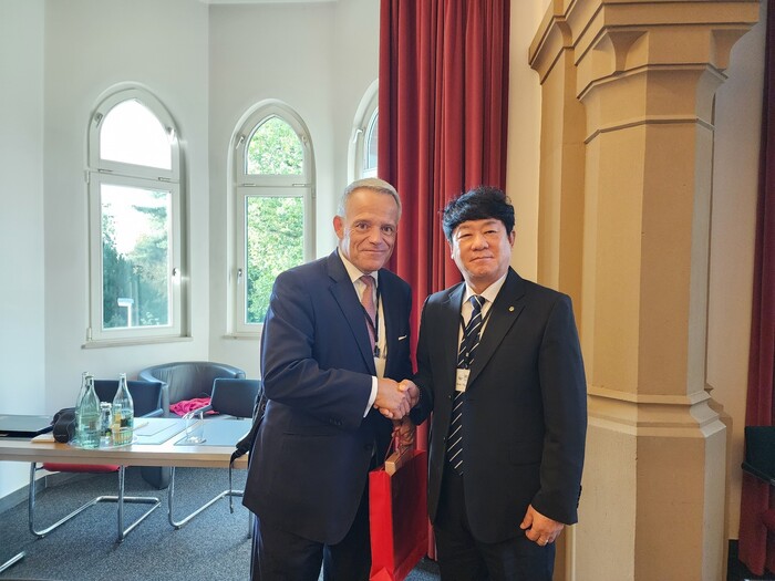 | ▲제15차 국제라이파이젠연맹 연차총회’에서 김윤식 신협중앙회장이 국제라이파이젠연맹 이사 연임에 성공했다. (좌측부터) 가이 호프만 IRU 회장, 우측 김윤식 신협중앙회장 (사진=신협중앙회) |