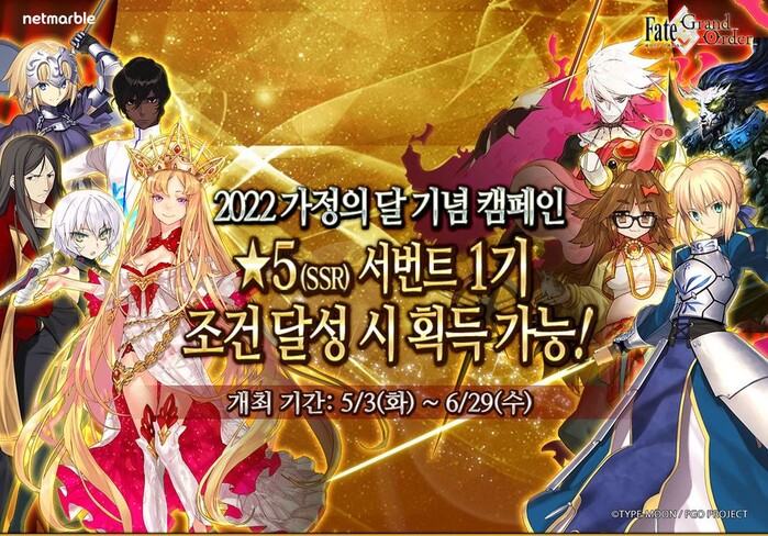 넷마블은 ‘2022 가정의달 캠페인’을 맞아 특설 사이트를 오픈하고 <페이트/그랜드 오더>국내 서비스 최초로 5성 서번트를 모든 이용자에게 증정한다고 4일 밝혔다.