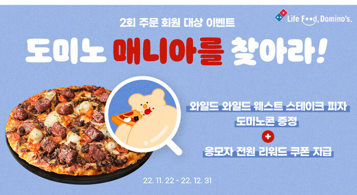 이번에 진행하는 ‘도미노 매니아를 찾아라’ 이벤트는 오는 12월 31일까지 온라인으로 모든 피자(L) 2회 이상 주문한 고객을 대상으로1천 명을 추첨해 ‘와일드 와일드 웨스트 스테이크 피자’ 도미노콘을 증정한다.