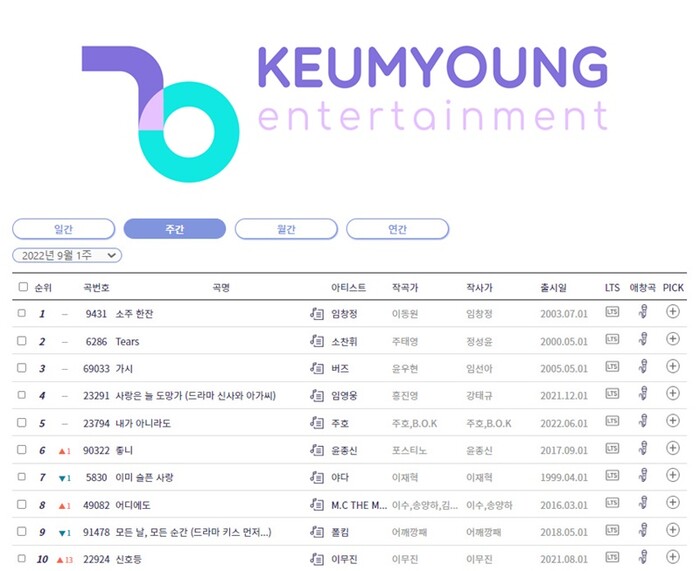 한편 금주 금영노래방 차트에 따르면 1위부터 10위까지 발라드가 무려 5곡이나 올라오며 발라드의 저력을 보여주고 있다. 1위‘소주 한 잔’을 포함해 4위 임영웅의‘사랑은 늘 도망가’, 5위 주호의‘내가 아니라도’, 8위‘폴킴의 모든 날,모든 순간’, 9위 윤종신의‘좋니’가 순위권을 차지했다.