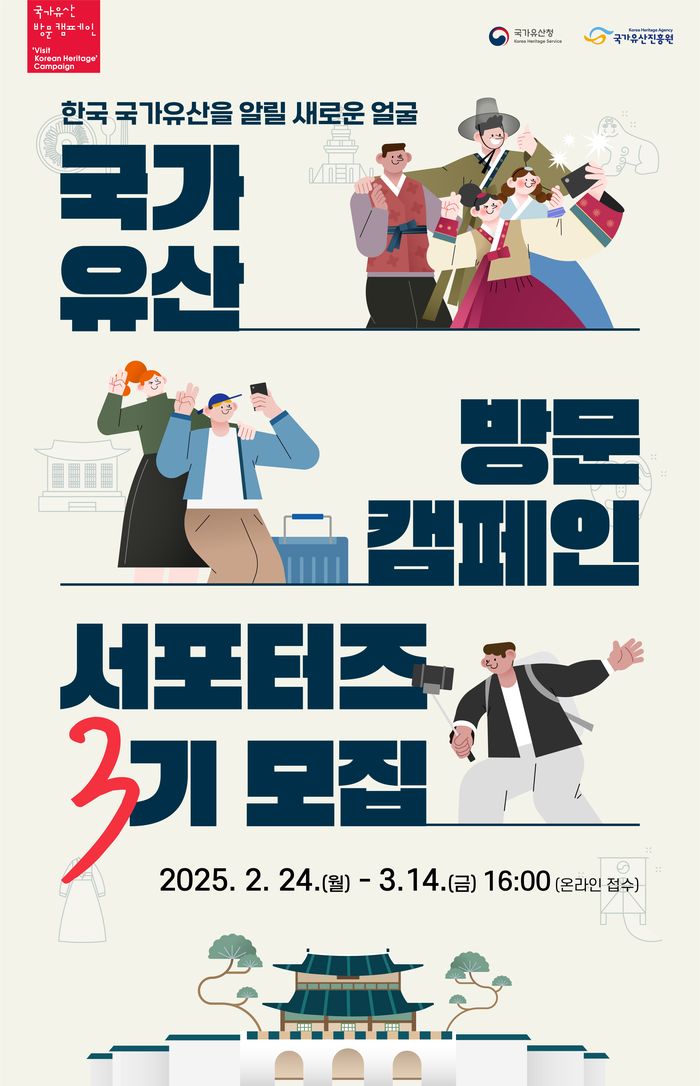국가유산청과 국가유산진흥원이 올해 '국가유산 방문 캠페인'을 함께 할 ‘국가유산 방문 캠페인 서포터즈’와 ‘국가유산 방문코스 활동가’를 모집한다.