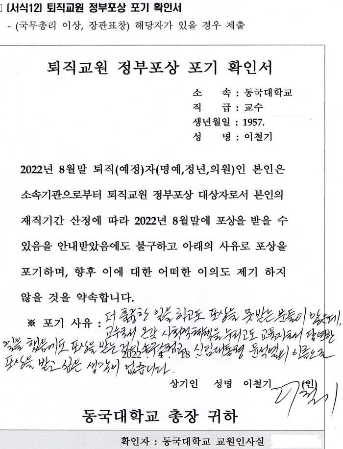 이 교수는 지난 27일 페이스북에 이달 말 정년 퇴임 소식을 알리며 동국대에 제출한 퇴직 교원 정부 포상 포기 확인서를 공개했다.