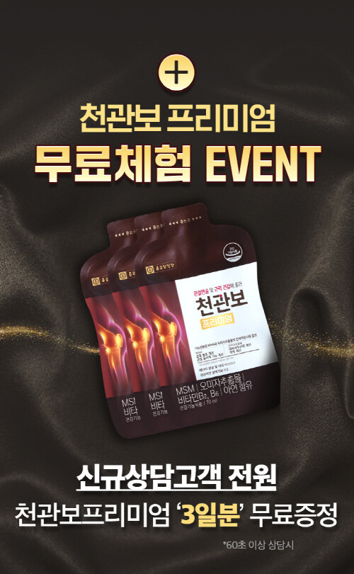 종근당건강은 관절건강기능식품 ‘천관보 프리미엄’을 무료 체험할 수 있는 이벤트를 진행한다고 밝혔다.
