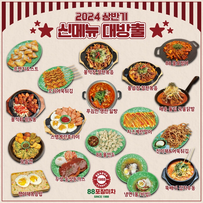 신메뉴 라인업은 ‘88 명예의 안주’에 포함된 88 불오징어와 매운 튤립 국물 닭발(기존 ‘국물 닭발’ 메뉴 리뉴얼)‘기본 안주’인 치즈 계란말이를 비롯해 ‘간편 안주’ 프렌치토스트, 꼬지 어묵 튀김, 88 물만두, 뚝배기 김치 우동, 등 11종, ‘식사 안주’인 햄야채볶음밥, 냉면(물/비빔)까지 총 17종이다.