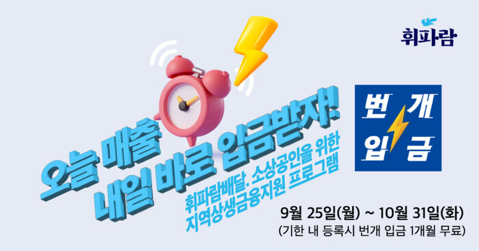 이 서비스는 365일 당일 매출을 익일 오전 10시까지 선입금해주는 ‘펀다’의 서비스로, 제휴를 통해 휘파람 배달 매장을 대상으로 해당 서비스를 1개월 무료로 제공한다.