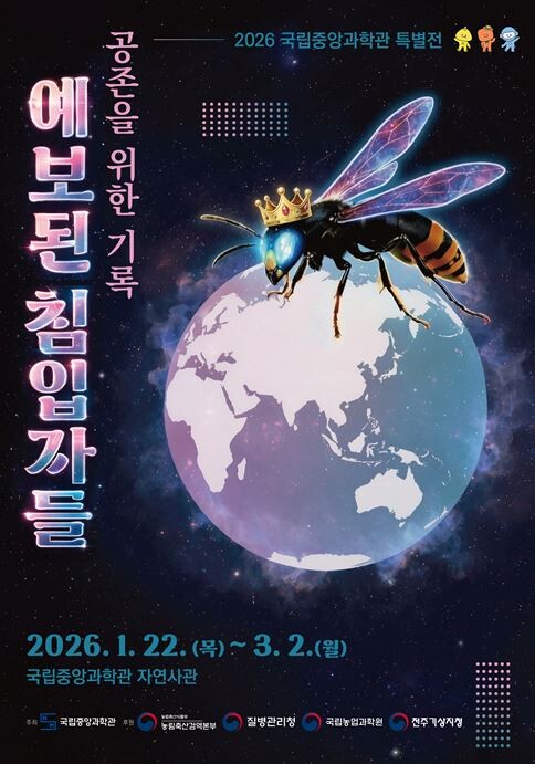 국립중앙과학관이 오는 1월 22일부터 3월 2일까지 자연사 관에서 인공지능(AI) 기술을 활용해 다양한 기후변화에 따른 해충의 위협과 슬기로운 대응을 다룬 해충특별전, ‘2026년 예보된 침입자들: 공존을 위한 기록’을 개최한다고 20일 밝혔다.