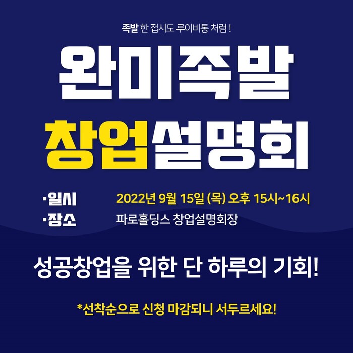 이번 창업설명회는 사전 예약자만 참석 가능하며 자세한 내용은 완미족발 공식 홈페이지 또는 대표 전화를 통해 확인할 수 있다.