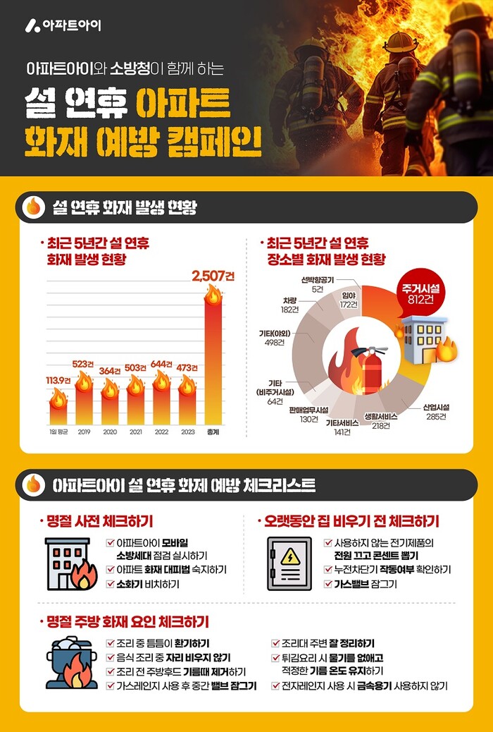 아파트아이는 소방청과 함께 명절 기간 ‘아파트 화재 예방 캠페인’을 진행하고 ‘설 연휴 화재 예방 체크리스트’를 배포, 자체 화재 점검 중요성을 강조할 계획이라고 밝혔다.