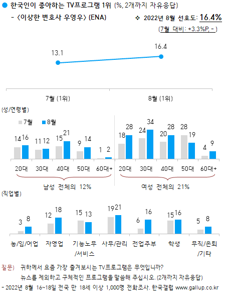 한국갤럽은 지난 16일부터 18일까지 전국 만 18세 이상 1000명에게 요즘 가장 즐겨보는 TV프로그램을 물은 결과(2개까지 자유응답), ‘이상한 변호사 우영우‘가 선호도 16.4%로 두 달 연속 1위를 차지했다고 22일 밝혔다.
