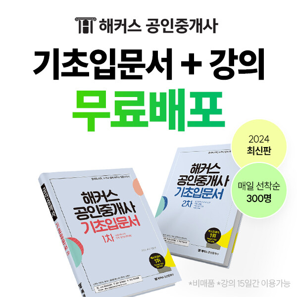 이번 이벤트를 통해 매일 선착순 300명에게 최신 기초 입문서와 강의를 배송비까지 무료로 제공된다. 공인중개사 1차, 2차 입문서 2권의 교재와 함께 전 과목 교수진의 최신 입문강의를 받아볼 수 있다. 해당 교제들은 모두 비매품이며, 강의는 15일간 이용 가능하다.