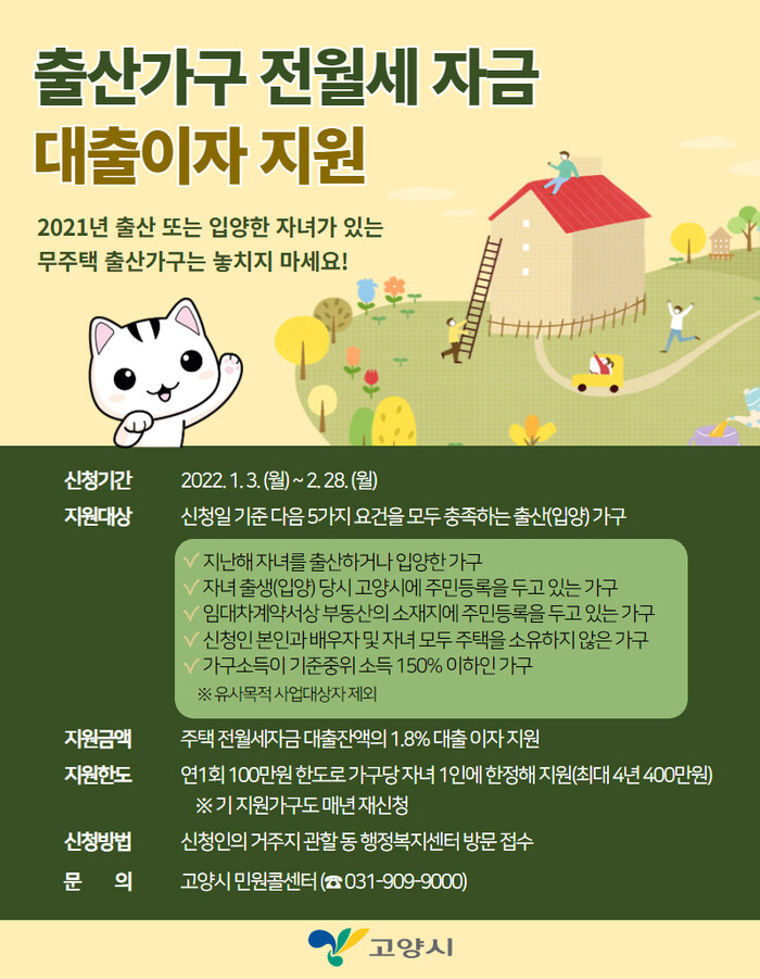 고양시 출산가구 전월세자금 대출이자 지원사업은 자녀 1인에 한정해 4년간 최대 400만원을 지원하는 제도다. 2021년 출산 또는 입양한 자녀가 있는 무주택 출산가구에 전월세자금 대출잔액의 1.8%에 해당하는 대출이자 100만원이 한도이다.