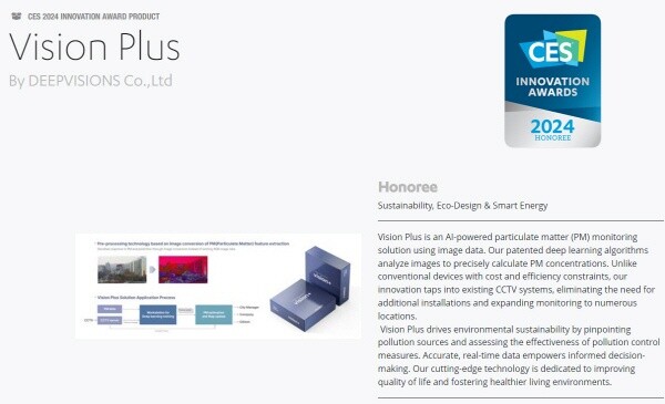 ㈜딥비전스는 디지털 영상 기반 AI미세먼지 농도측정 솔루션인 ‘비전플러스’로 ‘CES 2024 혁신상’을 수상했다고 밝혔다.