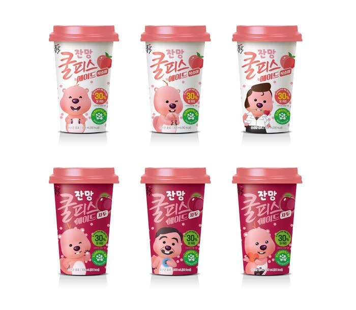 이번 협업 제품은 MZ세대에게 친숙한 잔망루피 캐릭터를 신제품 ‘쿨피스 에이드’ 패키지에 그려 넣었다. 잔망루피의 귀엽고 익살스러운 표정이 각각 그려진 6가지 디자인으로 구성됐다.