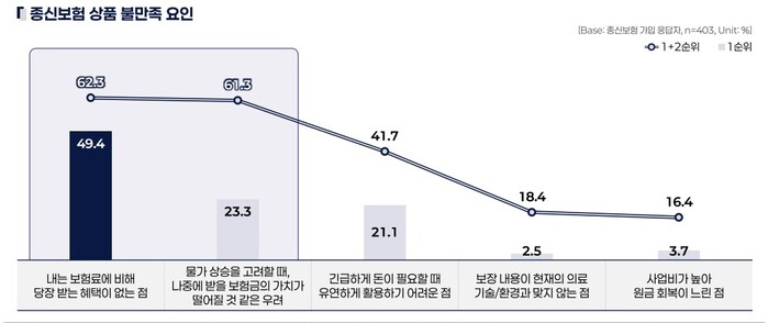 응답자 중 절반(49.4%)은 종신보험의 가장 큰 불만으로 ‘당장 받는 혜택이 없다’고 답했다. 이어 ‘보험금의 가치 하락’(23.3%), ‘유연하게 활용하기 어려운 점’(21.1%) 등의 순으로 나타났다.