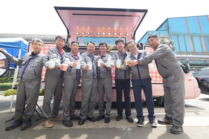 동국제강은 8일을 ‘DK아이스데이’로 정하고 인천·당진·포항 3개 사업장에 푸드트럭 5대를 보내 협력사를 포함한 현장 근로자 2,000여명을 대상으로 커피·에이드·티 등 냉음료 5종을 제공하고 ‘행운의 룰렛’ 경품 이벤트를 진행했다.