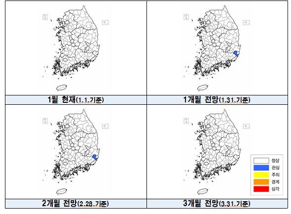 기상 전망상 1월 강수량은 평년과 비슷하고, 2∼3월은 평년보다 대체로 많을 것으로 예상된다.