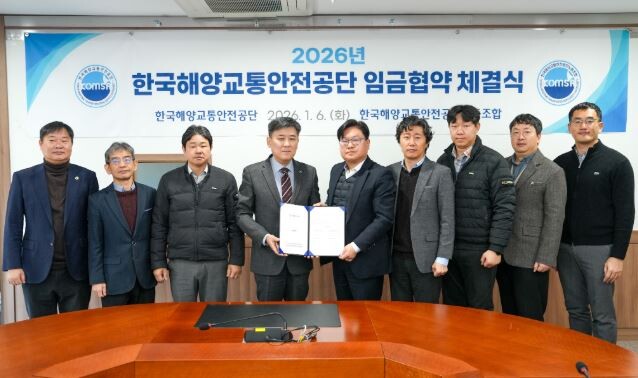 | ▲김준석 한국해양교통안전공단 이사장(왼쪽 네번째)과 송명섭 노조위원장(오른쪽 다섯번째)이 1월 6일(화) 공단 본사에서 2026년도 임금협약을 체결하고 기념촬영을 하고 있다. (사진=한국해양교통안전공단 제공) |