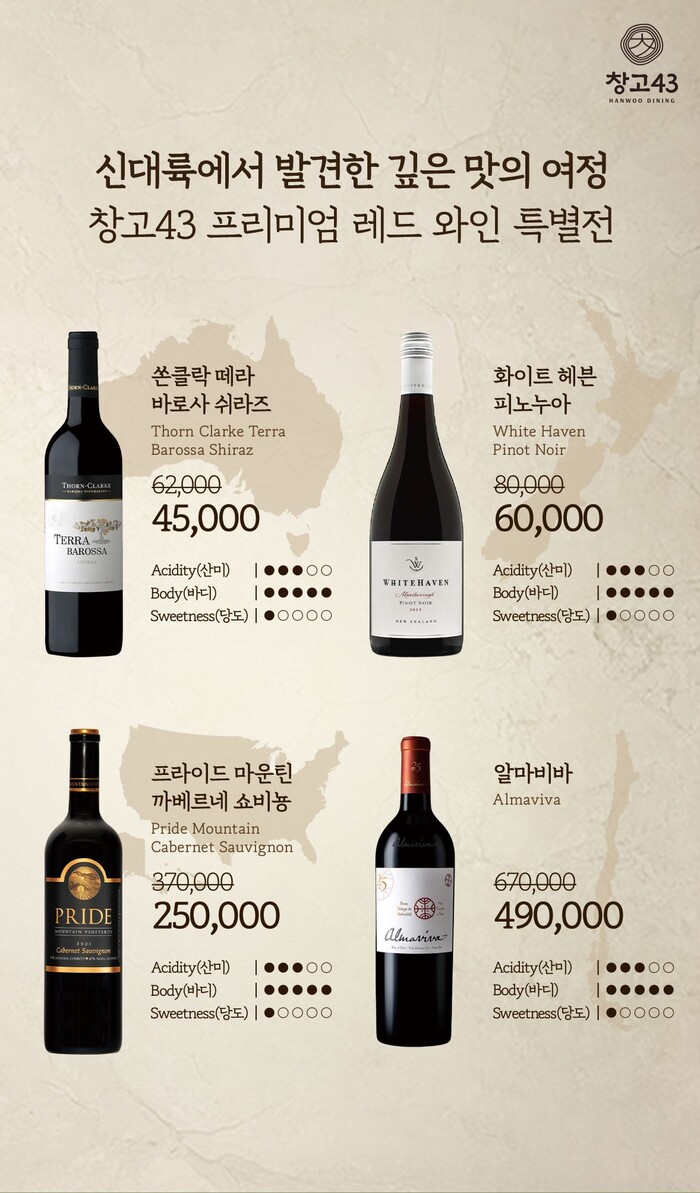 고병환 다이닝브랜즈그룹 창고43 본부장은 “이번 프로모션은 신대륙 와인 특유의 풍부하고 깊은 맛을 통해 한우 미식 경험의 깊이를 확장하고자 마련되었다”라며, “업계 최고 수준의 콜키지 프리 서비스와 함께 창고43이 정성스럽게 큐레이션한 와인을 즐기며 더욱 완성도 높은 신년 모임을 만드시길 바란다”라고 전했다.