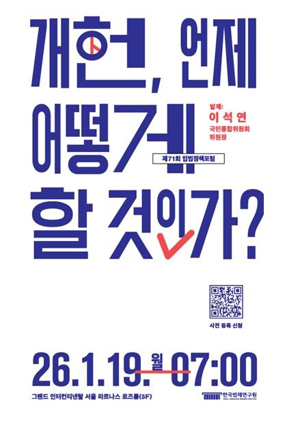 한국법제연구원이 19일 그랜드 인터컨 서울 파르나스 로즈룸(5F)에서 이석연 국민통합위원회 위원장을 발제자로 초청해 ‘개헌, 언제 어떻게 할 것인가?’를 주제로 제71회 입법정책포럼을 개최한다.