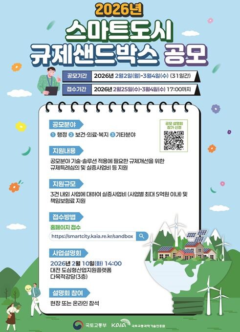 [매일안전신문=김진섭 기자] 국토교통부가 스마트도시 기술·서비스의 규제 완화 및 해소를 지원하는 스마트도시 규제샌드박스 실증사업 공모를 추진한다.