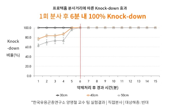 특히 국보싸이언스 관계자는 “프로텍홈은 가정에서 손쉽게 사용할 수 있는 빈대, 파리 살충제로 한국유용곤충연구소 양영철 교수(을지대 보건환경안전학과 교수)와 진행한 빈대 효력 시험을 통해 빈대에게 1회 분사 후 5~6분 이내에 녹다운되는 효과를 확인했다”고 밝혔다.