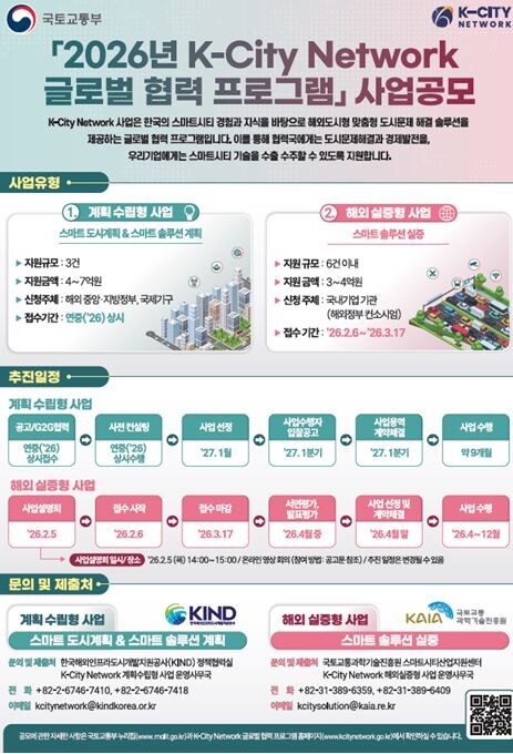 국토교통부 김연희 도시경제과장은 “K-City Network 글로벌 협력사업은 해외 도시와 함께 스마트도시를 기획하고 현장에서 실증까지 이어지는 대표적인 글로벌 협력 플랫폼”이라며, “26년에는 AI 융합 스마트 솔루션의 해외 적용을 확대해 우리기업의 지속가능한 해외수출과 글로벌 경쟁력 강화를 적극 지원하겠다”고 밝혔다.