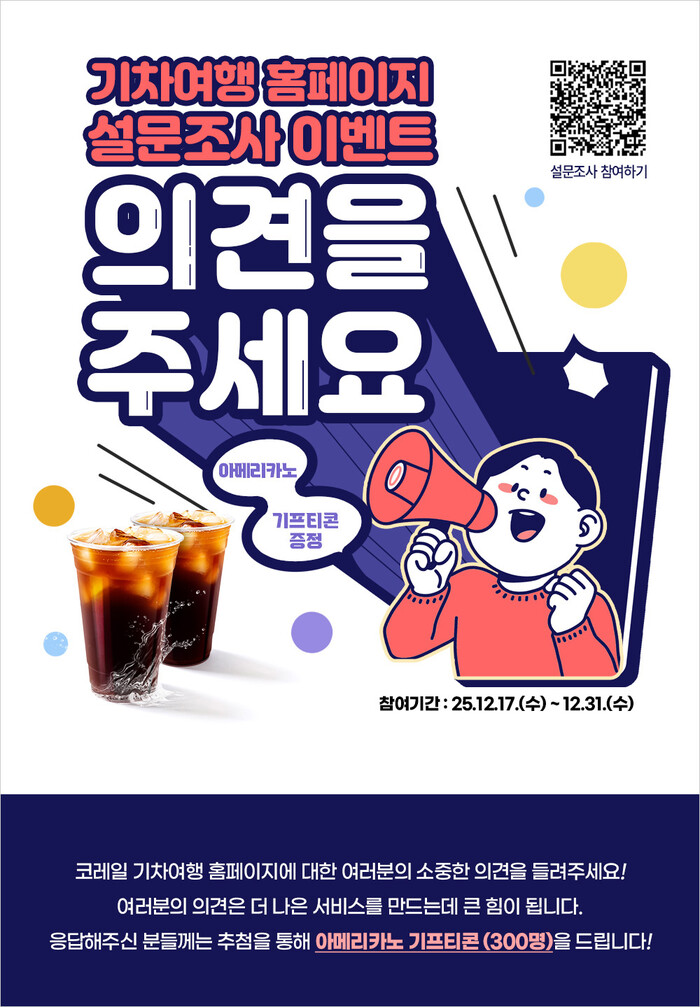 이민성 코레일 고객마케팅단장은 “국민들의 소중한 의견을 반영해 더욱 편리하고 유용한 기차여행 콘텐츠를 제공할 수 있도록 설문에 많은 관심과 참여를 부탁드린다”고 밝혔다.