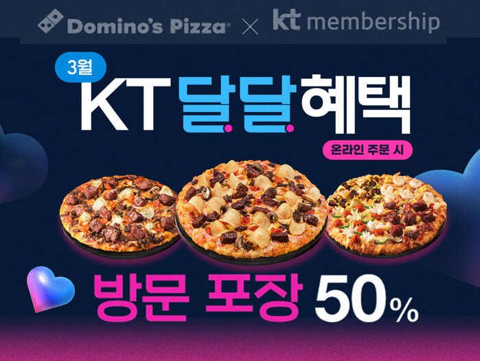 오늘부터 오는 31일까지 진행되는 ‘KT 달달혜택’ 프로모션은 KT 전 등급 고객을 대상으로, KT 멤버십 ID 당 월 1회, 2만 5천 원 이상 4만 5천 원 이하 온라인 포장 주문 시 50% 포인트 차감 할인 혜택을 제공한다. 자세한 내용은 도미노피자 홈페이지 및 KT 멤버십 3월 달달 혜택 이벤트 페이지에서 확인할 수 있다.