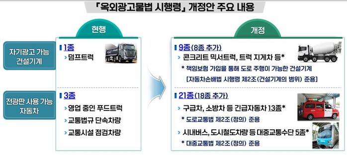 기존 시행령에서는 건설기계관리법상 34종(특수건설기계 8종 포함)의 건설기계 중 덤프트럭만을 자기광고가 가능한 교통수단으로 규정하고 있었다.