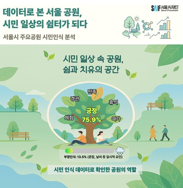서울AI재단이 서울 26개 공원에 대한 시민 인식 분석 결과를 공개했다. 실제 공원 이용 경험과 정서 반응을 데이터로 살펴본 이번 분석은 ‘공원’이 시민 일상에 어떤 의미를 주는지를 입체적으로 파악하고 「정원도시 서울」 정책 추진을 위한 기초자료를 제공하기 위해 진행됐다.