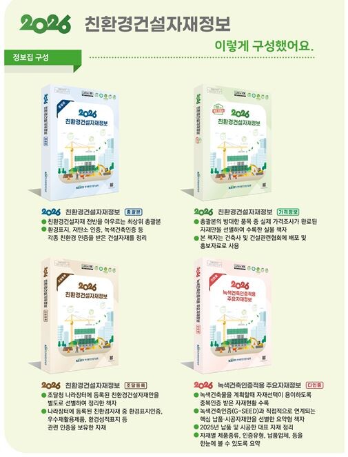 [매일안전신문=김진섭 기자] 기후에너지환경부 산하 한국환경산업기술원이 오는 10일 수요자 맞춤형으로 확대 개편한 ‘2026 친환경 건설자재 정보집’을 발간한다.