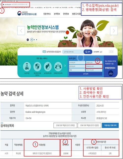 | ▲과수화상병 등록약제 확인(농약안전정보시스템) (사진=농촌진흥청 제공) |