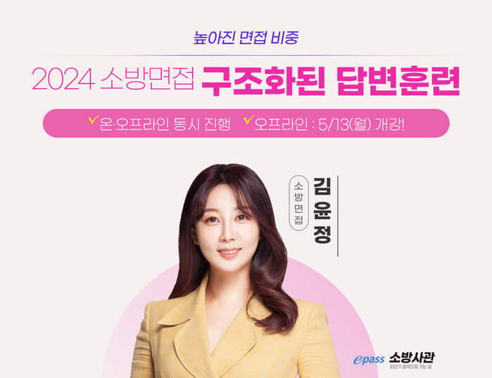 면접 특강반은 2023년 소방면접 전원 합격을 배출한 면접 전문 김윤정 강사가 직접 진행한다. 수험생은 면접특강을 통해 개별면접 및 3분 발표면접을 한 번에 익힐 수 있으며 소수정예 면접지도와 1대1 면접시험 맞춤 관리를 받을 수 있다.
