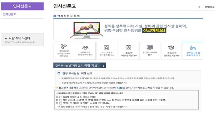 | ▲전자인사관리시스템(e-사람) 내 익명 신고센터 화면 (사진=인사혁신처 제공) |