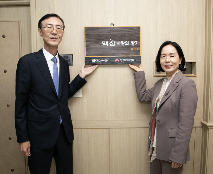 | ▲20일 인천광역시 부평구에 위치한 인천상정초등학교에서 진행된 ‘제16회 맥심 사랑의 향기’ 악기 기증식에서 동서식품 최상인 홍보상무(왼쪽)와 인천상정초등학교 이숙경 교장(오른쪽)이 현판과 함께 기념촬영을 하고 있다. (사진=동서식품) |